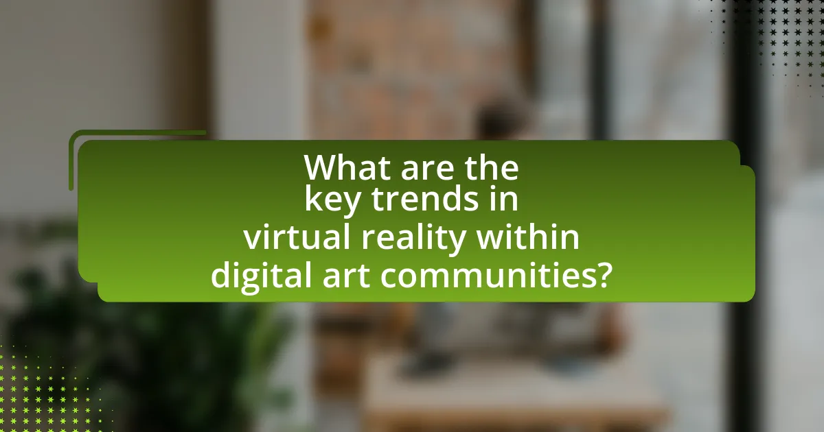 Key trends in virtual reality within digital art communities include increased collaboration among artists, immersive experiences for audiences, and the integration of blockchain technology for digital ownership. Artists are leveraging virtual reality platforms to collaborate in real-time, creating shared spaces where they can experiment and innovate together. Immersive experiences are becoming more prevalent, allowing audiences to engage with art in three-dimensional environments, enhancing emotional connections and interactivity. Additionally, the use of blockchain technology is gaining traction, enabling artists to tokenize their work, ensuring provenance and ownership in the digital realm. These trends reflect a shift towards more interactive, community-driven, and secure practices in digital art.
